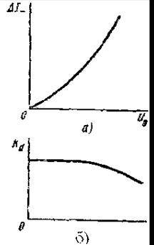 Рис. 3. Первой основной характеристикой амплитудного детектора является его детекторная характеристика—доказывающая, как изменяется выходной ток детектора при изменении амплитуды входного высокочастотного напряжения. Учитывая, что в реальных радиоэлектронных устройствах частота модулирующего напряжения значительно меньше модулируемого (F ≤ fo), изменение амплитуды входного высокочастотного напряжения детектора можно рассматривать как очень медленное, в пределе полагая, что амплитуда высокочастотного сигнала постоянна (Uвх = Uo cosωоt). Тогда результатом детектирования будет постоянная составляющая выходного тока детектора I. Однако в общем случае на выходе детектора будет некоторый постоянный ток Iо и при отсутствии входного сигнала. Поэтому полезным результатом детектирования будет ток: DI =I – I0 а детекторной характеристикой будет зависимость DI = f (U0) (13) Типичная детекторная характеристика представлена на рис. 4.а. По детекторной характеристике легко оценить качество детектирования. Рабочим участком детекторной характеристики, естественно, является линейный участок, где изменение выходного тока детектора в точности соответствует изменению амплитуды входного ВЧ напряжения (огибающей). Чем больше линейный участок детекторной характеристики, тем большие изменения М возможны, т. е. тем лучше схема детектора.