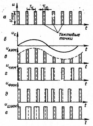 Рис.14. Импульсная модуляция: а последовательность немодулированных видеоимпульсов; б отрезок модулирующего сигнала (тон); в последовательность импульсов при АИМ; г последовательность импульсов при ЧИМ; д последовательность импульсов при ФИМ; Характерно, что, если для манипуляции частота FM введена условно, в случае импульсной модуляции РИ отражает фактическое наличие импульса на интервале 7И, который отсчитывается между таковыми точками – серединами соседних немодулированных импульсов. Изображённая на рис. 14. а последовательность прямоугольных импульсов нашла наибольшее применение для модуляции СВЧ- генераторов импульсных радиолокаторах, где длительность импульсов и частоту следования выбирают в пределах τи= 0,1- 10мкс; Fи= 0,1- 100 кГц. В радиосвязи последовательность импульсов (рис. 14. а) сначала модулируется информационным сигналом и только после этого используется для модуляции несущей. На рис. 14. б показан отрезок гармонического модулирующего сигнала, а на рис. 14.в, г, д, е, приведены графики, иллюстрирующие различные виды модулирующих импульсов при импульсной модуляции. При амплитудно-импульсной модуляции (АИМ) изменяемым параметром является амплитуда импульсов (рис. 14. в). При частотно-импульсной модуляции (ЧИМ) изменяется частота следования (рис. 14. г), а при фазоимпульсной (ФИМ) – фазовый сдвиг импульса относительно таковой точки (рис. 14. д). И при ФИМ, и при ЧИМ импульсы могут быть смещены относительно таковых точек не более чем на половину периода Ти. При широтно-импульсной модуляции (ШИМ) изменяется ширина импульсов. Возможно одностороннее и двустороннее расширение. На рис. 14. е изображён график,иллюстрирующий двустороннюю ШИМ. Для всех видов импульсной модуляции должно выполняться условие Fи>2Fmax. Спектр последовательности прямоугольных импульсов (дискретный участок его) показан на рис. 15.а для случая Ти = 5τи. После модуляции видеоимпульсов около каждой спектральной составляющей появляется спектр боковых частот, определяемый видом модуляции (рис. 15.б). Спектр радиоимпульсов (рис. 15. в) теоретически бесконечен, практически в радиотрактах его ограничивают значением Пf = 2/τи. Импульсная модуляция применяется преимущественно в диапазоне УКВ, так как в большинстве случаев соответствующие ей радиосигналы занимают широкий спектр частот, который нельзя втиснуть даже на КВ. Лучшей помехоустойчивостью отличается ФИМ, худшей — АИМ. Импульсную модуляцию широко используют в многоканальной радиосвязи с временным уплотнением. Она организуется следующим образом. Каждый передаваемый сигнал модулирует свою последовательность импульсов. Затем последовательности в определенной очередности вводятся в общий тракт передатчика, так что между импульсами одного канала размещаются импульсы других каналов, не перекрываясь. На выходе приемника импульсы разделяются по своим каналам, где и выделяется переданная информация. В передатчиках авиационных РТС находит применение и считается перспективной комбинированная модуляция. Комбинированной модуляцией принято называть такую модуляцию, при которой по закону модулирующих сигналов изменяются не менее двух параметров несущей. В командных самолетных MB — ДМВ-радиостанциях, например, возможна комбинированная модуляция в варианте AM — ЧТ, в РЛС применяются внутриимпульсная ЧМ и внутриим