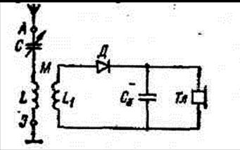 Рис.1. Схема детекторного приемника. Приемная установка состоит из приемной антенны А с заземлением 3 и собственно приемника. Между А и 3 внутри приемника находится так называемое входное устройство, содержащее конденсатор переменной емкости С и катушку L. Эти элементы входят в цепь антенны и позволяют настроить эту цепь на частоту желательного радиосигнала, т. е., как говорят, на принимаемую станцию. Условием настройки является компенсация реактивного сопротивления антенны Ха+ωL— 1/ωС = 0. Именно этот резонанс обеспечивает простейшему приемнику избирательность, т. е. возможность приема радиосигналов какой-либо одной радиостанции при подавлении сигналов от радиостанций, излучающих волны других частот. Процесс извлечения энергии из электромагнитного поля осуществляется в антенной цепи. Приходящие радиоволны наводят в приемной антенне ЭДС, частота которой равна частоте радиосигнала. Это равноценно включению в цепь антенны генератора ЭДС. Наибольшую мощность этот генератор развивает при резонансе е цепи антенны, т. е. при отсутствии реактивного сопротивления. Так происходит преобразование энергии поля в энергию переменного тока высокой частоты. Сигналы на волнах другой длины наводят ЭДС с другими частотами, а потому для них в цепи антенны имеется не только активное, но и реактивное сопротивление, не позволяющее им развивать полную мощность тока высокой частоты. В этом — смысл избирательности приемника. Энергия полезного радиосигнала должна быть преобразована в энергию сигнала первичной формы. Так, для радиосигнала с AM первичным сигналом является ток звуковой (модулирующей) частоты. Этот этап преобразования осуществляется в детекторной цепи. Детекторная цепь состоит из катушки L1, имеющей индуктивную связь М с катушкой цепи антенны, собственно детектора Д и потребителя первичного сигнала — телефона Тл, блокируемого параллельным, конденсатором Сб. Связь детекторной цепи с цепью антенны должна обеспечить передачу наибольшей возможной мощности радиосигнала детектору (рис. 2). Детекторная цепь, связанная с антенной, является цепью апериодической. Ток антенной цепи наводит в катушке L1 ЭДС высокой частоты, для которой конденсатор Сб является практически коротким замыканием. Поэтому напряжение высокой частоты с зажимов катушки L1 оказывается приложенным полностью к детектору. Потребителем энергии тока звуковой частоты i3, возникающего в цепи диода, служит телефон, преобразующий электрический сигнал в акустический.