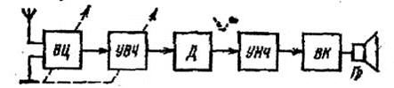 Рис.4. Структурная схема приемника прямого усиления. Приемник прямого усиления сходен по физическим процессам с простейшим приемником, отличаясь лишь добавленными к последнему каскадами усиления в двух частотных областях. Недостатки, двойственные простейшему приемнику, не устраняются в полной мере и в приемнике прямого усиления. Так, например, полоса пропускания его в диапазоне KB всегда шире требуемой для радиотелефонии. В настоящее время приемники прямого усиления промышленностью не выпускаются; радиолюбители иногда собирают приемники прямого усиления на транзисторах. В супергетеродине осуществляется, по меньшей мере, двукратное преобразование частоты. Частота принимаемого радиосигнала преобразуется в постоянную для данного приемника промежуточную частоту, а эта последняя в процессе детектирования преобразуется в звуковую частоту первичного сигнала. В соответствии с этим структурная схема супергетеродина (рис. 5) содержит входные цепи ВЦ, усилительные каскады высокой частоты УРЧ, преобразователь частоты ПЧ, усилительные каскады промежуточной частоты УПЧ, детектор и усилитель низкой частоты УНЧ. Перестройке подвергаются - входные цепи, усилитель высокой частоты и гетеродин преобразователя частоты, причем настройка также должна быть сопряженной. Появившееся на заре ламповой радиотехники название «супергетеродин» должно было отразить тот факт, что в результате первого преобразования частота получалась не звуковой, а сверхзвуковой (суперзвуковой, т. е. радиочастотой). Постоянная настройка каскадов усиления промежуточной частоты дает возможность применять в них совершенные фильтры, обеспечивающие высокую избирательность. Кроме того, усиление в трех различных областях частот позволяет достигнуть высокой чувствительности без угрозы самовозбуждения приемника. Эти свойства сделали супергетеродин, в сущности, основным типом схемы, находящим реализацию в промышленности. В супергетеродинах профессионального типа могут применяться два и даже три каскада преобразования частоты, но в радиовещательных приемниках структурная схема обычно соответствует рис. 5. Для того чтобы настройка приемника на волну принимаемой станции была одноручечной, конденсаторы переменной емкости входной цепи, УРЧ и гетеродина объединяются в блок. При сопряжении контуров входная цепь и УРЧ настраиваются на несущую частоту f0, а гетеродин — на частоту fг = fо±fпр Зависимость частоты fг от угла поворота ротора конденсатора делается такой,
