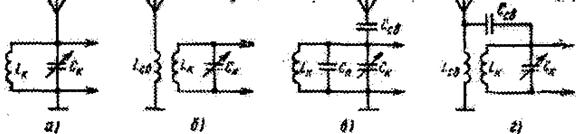 Рис.7. Схемы связи входной цепи с антенной: а) – непосредственная; б) – индуктивная; в) – емкостная; г) - комбинированная. Основные характеристики входных цепей. Входные цепи характеризуются следующими основными параметрами: коэффициентом передачи напряжения или мощности, коэффициентом избирательности, коэффициентом перекрытия диапазона, шириной полосы пропускания. Эти коэффициенты не являются постоянными и характеризуются коэффициентами непостоянства. Коэффициентом передачи по напряжению называют отношение напряжения сигнала на входе первого каскада приемника UBX1 к ЭДС сигнала в антенне ЕА: Ko=UBx1/Ea. Коэффициентом передачи по мощности называют отношение мощности сигнала на входе первого каскада Рвх к мощности сигнала в антенне Кр= Рвх/Ра. Поскольку входная цепь является резонансной системой, то напряжение на ее выходе, являющееся входным для первого каскада, зависит от частоты ее настройки.