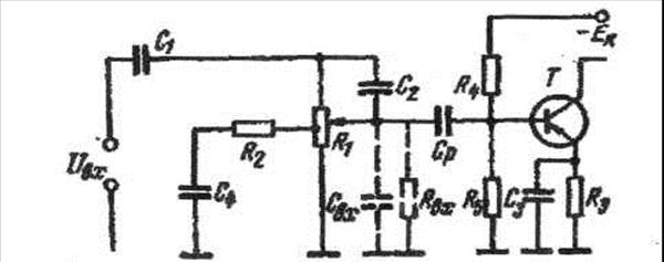 Рис. 5. В современных профессиональных приемниках часто применяют высокочастотные делители (аттенюаторы) на входе для уменьшения амплитуды сигнала, значительно превышающей чувствительность приемника. Аттенюатор ослабляет полезный сигнал до нормальной величины и одновременно ослабляет уровень всех мешающих сигналов, что уменьшает уровень нелинейных искажений и улучшает эффективную (многосигнальную) избирательность приемника. В низкочастотных каскадах ручная регулировка усиления осуществляется, как правило, с помощью делителей напряжения потенциометрического типа (на резисторах). В радиовещательных приемниках ручная регулировка усиления делается по низкой частоте после детектора в УНЧ. Применение для регулировки простого потенциометра в радиовещательных приемниках приводит к искажениям сигнала, связанным с особенностями человеческого уха. Человек плохо слышит негромкие звуки низкой и высокой частоты, но хорошо различает звуки средней частоты (1—3 кГц), имеющие ту же интенсивность. Для устранения такого рода искажений применяют схему регулировки, приведенную на рис. 6.