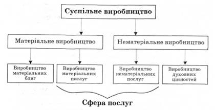Виробництво включає велику кількість галузей і підприємств, на яких створюють конкретні матеріальні блага чи послуги: машини, верстати, побутову техніку, продукти харчування, одяг, взуття тощо. Отже, виробництво — це процес створення різноманітних матеріальних благ та послуг, необхідних для задоволення людських потреб. Люди створюють матеріальні блага у взаємодії з природою. Без цієї взаємодії виробництво неможливе. У людській діяльності споконвічно використовувалися природні матеріальні блага і сили природи — сонце, вітер, вода, вогонь. Вивчаючи властивості природних благ, люди своєю працею змінювали їх форми і таким чином пристосовували для задоволення потреб. V цьому пристосуванні природних благ для задоволення людських потреб, власне, полягає суспільне виробництво. Суспільне виробництво поділяють на матеріальне і нематеріальне виробництво (рис. 1.2). До матеріальної сфери суспільного виробництва належать ті галузі виробництва, в яких виробляються матеріальні блага: вугілля, метал, нафта, машини, устаткування, сільськогосподарська продукція, електроенергія, продукти харчування тощо, і підприємства, що надають матеріальні послуги: вантажний транспорт, обслуговування і ремонт техніки, оптова торгівля і подібні. До сфери нематеріального виробництва відносяться галузі, що виробляють нематеріальні послуги, до яких належать: роздрібна торгівля, пасажирський транспорт, зв'язок, що обслуговує населення, підприємства побутового обслуговування, заклади охорони здоров'я та заклади, що створюють духовні цінності — у галузі освіти, культури, мистецтва тощо. Структуру суспільного виробництва можна показати схематично.