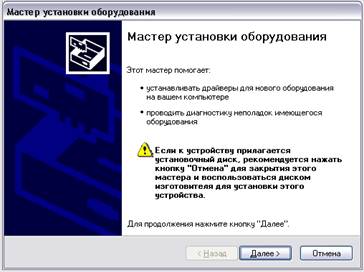 Упражнение 1: установка нового оборудования Когда устанавливается в компьютер новое оборудование, при запуске Windows система автоматически определяет его наличие и пытается установить необходимое для его работы. Однако если по каким-то причинам автоматического определения нового оборудования не произошло, вы можете запустить мастер установки оборудования самостоятельно. Следует отметить, что автоматически не распознаются чаще всего очень старые или очень новые устройства. Старые устройства не поддерживают автоматическое распознавание, а новые устройства просто не известны Windows XP, так как появились после выпуска системы. Иногда не могут быть опознаны некоторые экзотические устройства, не получившие широкого распространения. Следует также учитывать, что некоторые устройства могут быть не совместимы с Windows XP. В таком случае ничего сделать нельзя, и установить устройство у вас не получится. Если же устройство в принципе должно работать в системе Windows XP, но автоматически нужные драйверы не установились, следует воспользоваться услугами мастера установки оборудования.