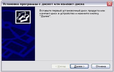 Установка программ состоит в использовании кнопки Добавить новые программы (Add New Programs) в диалоге установки и удаления программ. При нажатии этой кнопки внешний вид диалога изменится (Рис. 6.5). Данный диалог предназначен для добавления новых программ, а также для обновления Windows. Последняя операция происходит через Интернет, поэтому на компьютере должно быть настроено соединение с Интернетом. Обновление Windows представляет собой полностью автоматизированный процесс. От вас требуется установить соединение с Интернетом и нажать кнопку Обновление Windows (Windows update). Далее система все сделает сама. Чтобы установить новую программу, следует нажать кнопку Диск (CD or Floppy). При нажатии на эту кнопку запускается мастер установки программ (Рис. 6.6). Ваша задача -вставить компакт-диск или дискету с программой в дисковод и нажать кнопку Далее (Next) этого диалога. После этого система произведет поиск программы установки, и результаты этого поиска будут отображены в следующем диалоге мастера (Рис. 6.6).