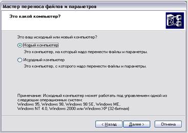 б) Рис. 6.7. Приветствие и выбор типа компьютера Если вы хотите, чтобы настройки Windows на нескольких компьютерах были одинаковы, то для этих целей удобно воспользоваться средством, которое называется мастер переноса файлов и настроек. Этот мастер может оказаться полезным, если вы приобрели новый компьютер и хотите перенести на него всю информацию со старого. Используя данный мастер, вам не придется запоминать множество настроек системы, а затем устанавливать их на новом компьютере. Перенос заключается в следующем. На старом и новом компьютерах необходимо запустить мастер. В первом случае мастеру необходимо указать, что он работает на старом компьютере, а во втором - что на новом компьютере. Мастер на старом компьютере автоматически соберет необходимую информацию и запишет ее на дискету или передаст на новый компьютер по сети. Мастер на новом компьютере прочитает эту информацию, автоматически настроит Windows и перенесет необходимые файлы. Выберите команду меню Другие программы > Стандартные > Служебные > Мастер переноса файлов и настроек (More Programs > Accessories > System Tools > Files and Settings Transfer Wizard). Появится первый диалог мастера (Рис. 6.7). Нажмите кнопку Далее (Next) этого диалога, чтобы перейти к следующему диалогу мастера (Рис. 6.7). В этом диалоге вам следует уточнить, на каком компьютере запущен мастер: на новом или на старом. Чтобы собрать информацию о файлах и настройках, установите переключатель в положение Старый компьютер (Old Computer) и нажмите кнопку Далее (Next), чтобы продолжить работу. Появится следующий диалог мастера переноса файлов и настроек (Рис. 6.8,а). В этом диалоге следует указать, какой носитель информации будет использован для переноса файлов и настроек. Для больших объемов данных рекомендуется использовать домашнюю сеть, а для маленьких объемов, например, только настроек, подойдет и гибкий диск. Установите переключатель в нужное положение и нажмите кнопку Далее (Next), чтобы продолжить работу. Появится диалог мастера, определяющий, какую информацию следует переносить (Рис. 6.8,б). С помощью переключателя выберите, что необходимо переносить: только настройки, только файлы или и то и другое. Если вы хотите переносить не все файлы или не все настройки, установите флажок Выбрать (Customize).