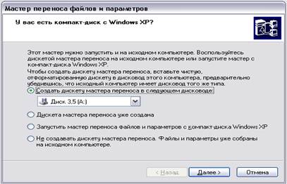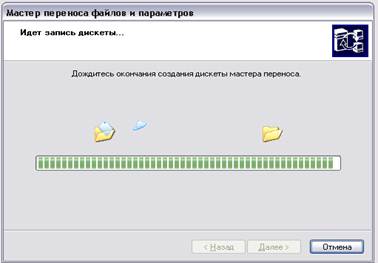 В левой части диалога расположен список переносимой информации. Вы можете удалять и добавлять различную информацию с помощью кнопок, расположенных в правой части диалога. После уточнения, какую информацию следует переносить, нажмите кнопку Далее (Next), чтобы начать процесс переноса. Этот процесс сопровождается появлением диалога с прогресс-индикатором, показывающим степень завершения процесса (Рис. 6.9). Если в качестве носителя была выбрана дискета, появится диалог с предложением вставить диск. Вставьте дискету и нажмите кнопку ОК для продолжения. По окончании записи информации диалог с прогресс-индикатором исчезнет и появится заключительный диалог мастера. Нажмите кнопку Готово (Finish) этого диалога, чтобы закрыть его и завершить работу мастера. Второй этап переноса файлов и настроек происходит на новом компьютере. Запустите на нем мастер переноса файлов и настроек и укажите в соответствующем диалоге, что вы работаете за новым компьютером. Появится диалог, спрашивающий, есть ли у вас установочный компакт-диск с Windows XP. Установите переключатель в положение Мне не нужен компакт-диск (I don't need CD) и нажмите кнопку Далее (Next), чтобы продолжить работу. Появится диалог для выбора носителя. В зависимости от того, что вы использовали как носитель на старом компьютере, установите переключатель в нужное положение.