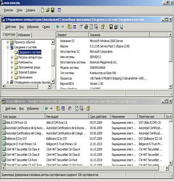 Рис 9.1. Окна консоли с индивидуальной настройкой. Общие папки. Используйте компонент "Общие папки" для просмотра информации о подключениях и общих ресурсах на компьютере. Вы можете создавать, просматривать и управлять общими ресурсами, просматривать список файлов и сеансов, открытых удаленными пользователями, закрывать эти файлы и сеансы. Локальные пользователи и группы. Используйте компонент "Локальные пользователи и группы" для создания и управления локальными учетными записями пользователей и локальными группами. Элемент "Локальные пользователи и группы" доступна только в Windows XP Professional. Оповещения и журналы производительности. Используйте компонент "Оповещения и журналы производительности" для управления журналами производительности, что позволяет просматривать и собирать данные о производительности Вашего компьютера. Диспетчер устройств. Используйте компонент "Диспетчер устройств" для просмотра списка установленного на Вашем компьютере оборудования, для обновления драйверов, изменения настройки оборудования, а также для устранения неполадок.