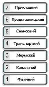 Основне завдання такої моделі - спрощення та полегшення обміну інформацією при використанні різних програмних та апаратних засобів. Розробку і впровадження еталонної моделі взаємодії відкритих систем можна вважати одним з найважливіших результатів в галузі стандартизації комп’ютерних мереж, який сприяє широкому впровадженню їх у різні сфери людської діяльності. 1.3. Рівні OSI Модель OSI є основою для розуміння яким чином передається інформація в глобальній мережі Інтернет. OSI модель пояснює, як пакети передаються між рівнями до інших пристроїв мережі, навіть якщо відправник та одержувач розділені різними мережними середовищами. Еталонна модель визначає сім функціональних рівнів, кожен із яких відповідає окремій фізичній або логічній частині комп'ютерної мережі та підтримує роботу вищих рівнів. Перевагами, які надає поділ мережі на сім рівнів, є: · Дозволяє виділити складові процесу взаємодії, що спрощує їх розгляд. · Стандартизує мережеве обладнання для виробників та технічної підтримки. · Дозволяє сумісно робити програмному забезпеченню з апаратним забезпеченням різних виробників. · Вона запобігає впливу змін в одному рівні на інші. · Ділить мережеву взаємодію на складові, що спрощує розуміння та вивчення.