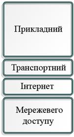 Як видно з схеми протоколи прикладного рівня використовуються для передачі файлів, електронної пошти, віддаленого входу в систему та задач керування мережею і включають такі протоколи: · File Transfer Protocol (FTP) · Hypertext Transfer Protocol (HTTP) · Simple Mail Transfer Protocol (SMTP) · Domain Name System (DNS) · Trivial File Transfer Protocol (TFTP) FTP – це протокол передавання файлів. Протокол FTP клієнт-серверний протокол прикладного рівня, який забезпечує пошук і пересилання файлів між двома, можливо, різнорідними комп’ютерами в мережі TCP/IP. Протокол FTP визначений специфікацією RFC 959 призначений для роботи з ftp-серверами. Використовує два паралельних TCP-з’єднані: порт 29 для пересилання даних і порт 21 – для керувального TCP-з’єднання. HTTP (Hypertext Transfer [Transport] Protocol) – протокол прикладного рівня, який використовується для передавання гіпертексту. Протокол HTTP це протокол «переговорів» про доставку веб-сервером документа веб-браузеру. HTTP застосовують також для передавання XML-файлів, VoiceXML, WML, потокового відео й аудіо. Зазвичай використовує порт 80, а TCP – як протокол транспортного рівня. Головний протокол World Wide Web «Всесвітньої павутини», визначений у RFC 1945 (HTTP 1.0), 2086 та 2616 (HTTP 1.1), за допомогою якого HTML-документи пересилають в Інтернеті від вузла до вузла. HTTP підтримує постійні (передавання багатьох об’єктів) і непостійні з’єднання (передавання одного об’єкта веб-документа за сеанс обміну між клієнтом і сервером), а також два методи ідентифікації користувачів: авторизацію й об’єкти (файли) cookie. Cookie - об'єкт (технологія) cookie, кукі-файл, підтримуваний протоколом HTTP текстовий запис розміром до 4 Кбайт із даними про користувача, що повертає веб-сервер під час реєстрації користувача, який зберігається на його персональному комп’ютері. У цей рядок потрапляє інформація, зібрана сервером про користувача. Сервери застосувань можуть записувати до кукі-файлів історію відвідування сайта, переглянуті сторінки, персональні настроювання, зроблені при відвідуванні сайта, список переглянутої реклами, пріоритети кожного користувача й залежно від цього робити конкретні пропозиції щоразу, коли клієнт заходить на сайт. Спочатку cookie були уведені фірмою Netscape Communications, їхній опис дано у специфікації RFC 2109. SMTP (Simple Mail Transfer Protocol) – це протокол прикладного рівня для передавання електронної пошти. Спочатку розроблено для мережі МО США (перший опис з'явився в 1982 p.). Складається з 14 команд, описаних у RFC 821, RFC 822 та RFC 2821. Використовують в мережі Інтернет для маршрутизації електронної пошти (базується на постійному TCP-з'єднанні, звертається до порту 25 сервера). DNS (Domain Name System - доменна система імен) служба доменних імен це -інтернет-служба, яка становить розподілену по всій земній кулі базу даних для ієрархічної системи імен мереж і комп'ютерів, підключених до Мережі, а також спосіб (протокол прикладного рівня) перетворення рядкових адрес інтернет-серверів у числові IP-адреси. Визначена в RFC 1034 і 1035. Протокол DNS працює над протоколом UDP і йому призначено порт за номером 35. DNS також часто використовують для розподілення навантаження між серверами ("дзеркалами"), що дублюють популярні сайти і поштові сервери. TFTP (Trivial File Transfer Protocol (Trivial FTP) - тривіальний протокол передавання файлів) протокол TFTP це - суттєво простіший, ніж FTP, протокол, використовуваний, наприклад, для дистанційного завантаження бездискових станцій. Забезпечує двостороннє без аутенти