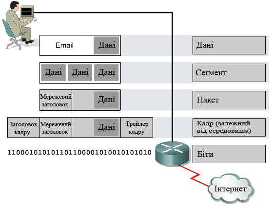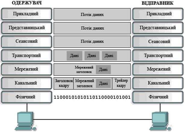Потік даних відправника починаючі з прикладного рівня передається далі вниз через інші рівні.