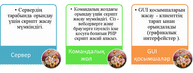 Сурет 5.1. Клиенттің серверде орындалатын бағдарламамен өзара әрекеті РНР тілі практикалық есептерді шешу мақсатында жасалған құрал ретінде пайдаланды. Оның құрастырушысы Расмус Лердорф,алғашында өз сайтында, оның online резюмелерiн қанша адам оқып отыратын бiлгiсi келдi, сол мақсатта қарапайым CGI – қабықты (оболочка) Perl, яғни Perl скриптінінен құралған қабықты жазады және оның ең басты мақсаты – сайтқа кіріп шығуды санайтын статистиканы жүргізу болды. Анықтама үшін CGI (Common Gateway Interface – шлюздердің жалпы интерфейсі) НТТР протокол негізінде жұмыс істейтін серверлік қосымшаларды құрастыруға арналған стандарт болып табылады. Мұндай қосымшаларды (оларды шлюздер немесе CGI – программасы деп атайды) нақты уақыт тәртiбiнде серверлермен iске қосылады. Сервер CGIнiң қолданушысының сұрау салуларын алып бередi,ал олар қолданушыға өз жұмысының нәтижесiн экранға қайтарып береді.Осылайша, пайдаланушы динамикалық ақпаратты ала алады және ол әр түрлә факторлардың әсерінен өзгеріп тұруы мүмкін. Ао шлюз (скрипт CGI) программалау тілдерінің кез келгенінде жазылуы мүмкін – Cи/C++, Fortran, Perl, TCL, UNIX Shell, Visual Basic, Python және т.б. Біраз уақыт өте, қабықшаның өнімділігі төмен болғандықтан, оны қайтадан енді, Си тілінде толықтырып, жазуға тура келдi. Осыдан кейін түпнұсқалар көпшіліктің назарына қателер мен қосымшаның түзетуi үшiн берілді. PHP орналасқан сайттағы сервердің пайдаланушыларына бұл өосымша инструмент ретінде қызықты болды және онымен жұмыс келген пайдаланушылар аз болған жоқ. Осылайша, РНР жекеленген проект ретінде 1995 жылы пайда болып, ең алғашқы версиясы Personal Home Page Tools (жеке беттермен жұмыс істеуге арналған құралдар) деген атпен жарияланады. Бұл бірнеше командаларды түсінетін кодтық анализатор, және утилиталардың жиынтығынан құралған (олар қонақ кітабын, статистиканы бақылайтын счетчиктер, чат және т.б. жасауға арналған). 1995 жылдың ортасына таман жағартылған РНР тілінің екінші версиясы шығады, оның аты PHP/FI(Personal Home Page / Forms Interpreter – персоналды веб бет/форманың интерпретаторы). Бұл қазіргі кездегі қолданып жүрген РНР дің базалық мүмкіндіктерді қосқан, сонымен бірге html-формаларды және html-кодтарға құрастырылу мүмкіндіктері пайда болды. Бұл РНР версиясы Perl синтаксисіне қатты ұқсады,бірақ біраз жеңілдірек болды. 1997 жылы РНР дің Си реализациясындағы PHP/FI 2.0 екінші версиясы жарық көреді. Бұл уақытта РНР тілін бірнеше мың адам қолданып жүрген, 50 мыңға жуық домені бар, ал бұл Internet домендерінің 1% құраған. РНР құрасытырушылардың саны бірнеше адамға дейін өсті, бірақ сонда да бұл бір адамның үлкен проектісі ретінде әлі де қала берді. PHP/FI 2.0 версиясы ресми түрде 1997 жылдың қараша айында жарық көрді, ал оның алдында тек бета версиясы ретінде ғана жарық көрген. Кейінірек оны РНР 3.0. альфа версиясымен ауыстырды. РНР 3.0 версиясы, бүгінгі таңдағы қолданылып жүрген РНР версиясына келеді. Оның PHP/FI 2.0 версиясынан айырмашылығы өте зор болған және ол белгілі бір қолданбалы есептерді шығара алатын қрал ретінде пайлануға болды. Оның құрастырушылары Энди Гутманс (Andi Gutmans) және Зив Сураски (Zeev Suraski) болды, олар 1997 жылы PHP/FI 2.0 кодын жаңадан жазды. Бұл версияның басты ерекшелігі, оның ядросынының кеңейтілу мүмкіндігі. Осы кеңейтілу мүмкіндігі көптеген құрастырушылардың назарын аударды, себебі олар енді бұл ядро негізінде өздерінің модульдерін жаза алды. Сонымен бұл версиясы мәліметт
