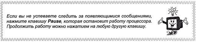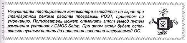 Отметим, что во время работы программы POST на экране появляются сообщения лишь о некоторых выполняемых операциях. На самом деле сценарий работы POST значительно обширнее. Так, например, между сообщениями о проверке памяти и инициализации дисковых устройств проводится тестирование клавиатуры, CMOS-памяти и системных часов, инициализация СОМ- и LPT-портов, тест контроллера НГМД. При возникновении ошибки в ходе тестирования на экран выводится соответствующее сообщение. Список таких сообщений мы приводим ниже в пункте «Сбои при запуске».