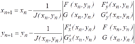 Исходные значения x0, y0 определяются приближенно. Метод Ньютона будет сходиться квадратично, с другой стороны, каждая итерация требует решения системы линейных уравнений, а также метод Ньютона требует вычисления всех n2 (n=2) первых частных производных нелинейных функций.