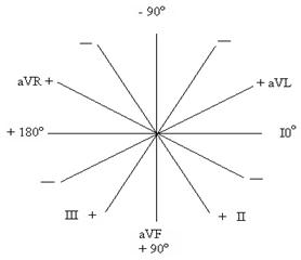 Тахікардія – це коли ЧСС швидша від верхньої межі норми і брадикардія – це коли ЧСС є повільніша від норми відповідного віку. 3. Вісь QRS. ● Зручним способом визначення осі QRS є застосування векторного підходу. А. Якщо комплекс QRS в І і аVF відведеннях спрямований вгору, то вісь серця розташована в квадранті 0 о - +90о. Для того, щоб визначити напрямок комплексу QRS треба порівняти величину позитивного (зубець R) та негативного (зубець S) зубців. В. Якщо зубець R в І направлений вгору, а в аVF вниз, то вісь розташована в квадранті 0 о - -90о. С. Коли зубець R в І направлений вниз, а в аVF вгору, то вісь розташована в квадранті +90 о - 180о. Д. Коли зубці R в І і аVF спрямовані вниз, то вісь розташована в квадранті -90 о - 180о. ● Знайти відведення від кінцівок (І, ІІ, ІІІ, аVR, аVL, аVF) в якому хвилі R і S є однаковими. Вісь QRS є перпендикулярною до цього відведення в попередньо (в п. 1) знайденому квадранті на схемі векторного підходу. У здорових дітей напрямок електричної осі серця співпадає з анатомічною віссю і змінюється з віком. Для дітей старшого віку і підлітків характерні наступні положення електричної осі серця: Ða = +300 – +700 – нормальне положення осі Ða = + 700 - + 900 – вертикальне положення осі Ða = > 900 - відхилення осі вправо Ða = + 300 – 0о – горизонтальне положення осі Ða < 00 - відхилення осі вліво