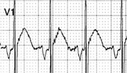 Синусовий ритм - це нормальний ритм в будь-якому віці. Для синусового ритму обов’язковими є дві ознаки: ● Зубець Р передує кожному комплексу QRS з однаковим РQ інтервалом (РQ інтервал може бути подовженим при атріовентрикулярній блокаді І ст.). ● Зубці Р в І і аVF направлені вгору від ізолінії. Остання ознака є дуже важливою у диференціації синусового ритму від не синусового. Синоатріальний вузол розміщений в правій верхній частині маси передсердя. Тому деполяризація передсердь проходить з правої верхньої частини до лівої нижньої, що створює напрямок осі Р вгору від ізолінії (рис. 8, 9).