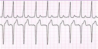 ІІІ. WРW. При синдромі WРW початкова частина комплексу QRS є розпливчата з ∆ хвилею. WРW синдром виникає внаслідок аномального провідного шляху (пучок Кента) між передсердям і шлуночком, минаючи затримку провідності в атріовентрикулярному вузлі. Для пацієнтів з синдромом WРW характерні приступи пароксизмальної надшлуночкової тахікардії (рис. 16). Критерії WРW синдрому 1. Вкорочення РR. Нижня межа норми РR: < 3 р. 0,08 сек 3 – 16 р. 0,1 сек > 16 р. 0,12 сек. 2. ∆ хвиля на висхідному плечі R. 3. Поширення QRS.
