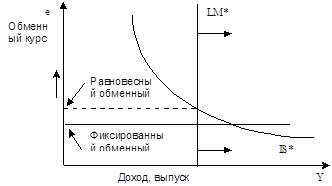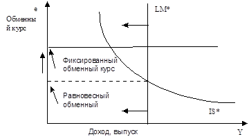 На рис.14а представлен равновесный обменный курс доллара выше фиксированного. Спекулянты получают прибыль за счет покупки иностранной валюты на рынке и последующей ее продажи Федеральной резервной системе. При этом увеличение денег автоматически увеличивается, кривая LM* смещается вправо, и обменный курс снижается.