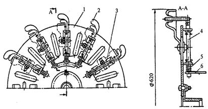 Рисунок 6.1 - Дисковий з ложечками садильний апарат саджалки КСМ-4А: 1 – диск; 2 – ложечка; 3 – кронштейн; 4 – затискач; 5 – пружина; 6 – важіль.