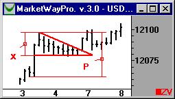 Цена пробивает как минимум на ценовую базу Р. В треугольнике не менее пяти волн. Их число нечетное.