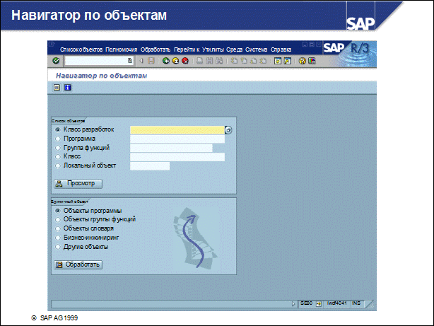 n SAP поставляет для АВАР-программ полный исходный текст. Клиенты могут просматривать коды и даже использовать их в качестве шаблонов для своих собственных программ. n Выполнив двойной щелчок в поле экрана Системный статус, можно перейти непосредственно к ABAP-инструментальным средствам. Инструментальные средства отображают исходный текст для релевантного контекста (при наличии соответствующего полномочия). n Наиболее важными инструментами разработок являются: навигатор по объектам (транзакция SE80); ABAP-редактор (SE38) для написания программ; редактор экранов и редактор меню для создания графических интерфейсов пользователя; построитель функций (SE37) для разработки функциональных модулей; построитель классов для объектно-ориентированного программирования; инструменты тестирования и оптимизации: отладчик; динамический анализ; SQL-трассировка; Computer Aided Test Tool (CATT) - инструментальные средства тестирования.