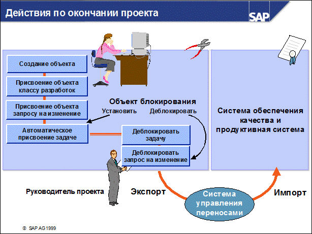 n При обработке разработчиками объектов в запросе на изменение эти объекты резервируются исключительно для данных разработчиков. n После завершения работы разработчики деблокируют свои задачи. Объекты и их блокировки передаются из задачи в запрос на изменение. Объекты все еще могут быть изменены всеми членами проектной группы, так как Организатор инструментальных средств (ОИС) при необходимости автоматически создает дополнительные задачи. n После завершения всего проекта руководитель проекта деблокирует запрос на изменение. При этом в запросе на изменение снимаются блокировки объектов. n Запросы на изменение могут быть переносимыми или локальными. ОИС автоматически классифицирует запросы в зависимости от их класса разработок. Ниже перечислены шаги, которые выполняются только после деблокирования переносимых запросов на изменение. Сразу же после экспорта запроса на изменение выполняется тестирование импорта, которое определяет, можно ли импортировать в целевую систему все объекты. Объекты репозитария экспортируются в каталог переноса. Результаты экспорта и тестового импорта записываются в журнал переносов, который затем проверяется разработчиками. n Импорт в целевую систему не осуществляется автоматически. Он выполняется в системе управления переносами (СУП). После завершения импорта можно проверить журнал импорта.