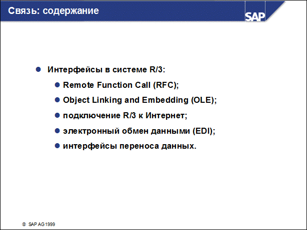 n Система R/3 является открытой системой. Она поддерживает множество сетевых протоколов связи. Обмен информацией между системами R/3, R/2 или внешними системами может осуществляться по сети. n SAP поддерживает протоколы Transmission Control Protocol/Internet Protocol (TCP/IP - протокол управления передачей/протокол Internet) и протокол SNA LU6.2 (System Network Architecture: Logical Unit 6.2). Связь внутри системы R/3 осуществляется с использованием стандартного протокола TCP/IP. Протокол LU6.2 разработан IBM и используется для связи с системами R/2, которые работают на мейнфреймах. n Прикладное программирование системы R/3 поддерживает следующие интерфейсы связи: CPI-C (Common Programming Interface Communication), RFC (Remote Function Call) и OLE -автоматизацию (Object Linking and Embedding). n Более подробная информация об организации связи содержится в онлайн-документации. Можно также заказать компакт-диск с SAP-документацией "Interface Adviser", в которой приведено множество конкретных примеров для описания различных механизмов связи в системе R/3. В SAPNet, например, в подкаталоге / int-adviser также можно найти дополнительную информацию по эти вопросам.