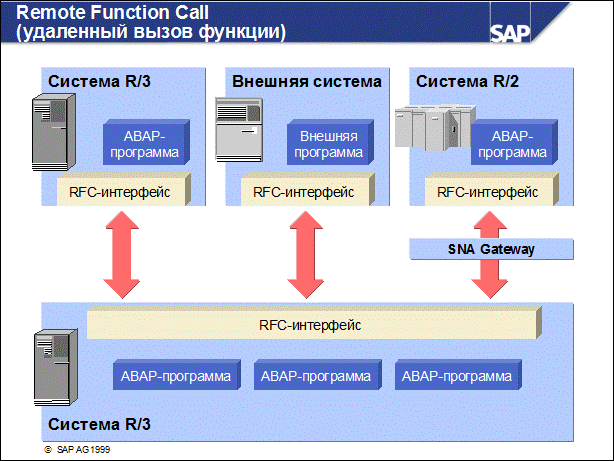 n Remote Function Call (RFC) - это интерфейс связи, основанный на протоколе CPI-C, но который имеет больше функциональных возможностей и проще для использования прикладными программистами. В качестве партнеров по связи через RFC можно использовать системы R/3 и R/2, а также внешние приложения. n Для связи с системами R/2 хотя бы на одном из серверов приложений необходимо дополнительное ПО (SNA-шлюз). См. также R/3-заметку 13903. n RFC является протоколом для вызова по сети специальных подпрограмм (функциональных модулей). Функциональные модули можно сравнить с функциями в языке Си или процедурами в Паскаль. Они имеют определенный интерфейс, через который можно осуществлять обмен данными, таблицами и кодами возврата. Для управления функциональными модулями в системе R/3 есть собственная библиотека функций, называемая построителем функций. n Построитель функций (транзакция SM37) предоставляет прикладным программистам удобную среду для программирования, документирования и тестирования функциональных модулей, которые могут вызываться локально или удаленно (дистанционно). Система R/3 автоматически генерирует дополнительный код (заглушку RFC), который необходим для обеспечения удаленных вызовов. n Технические требования для RFC такие же, что и для CPI-C. Ведение параметров для RFC-подключений осуществляется при помощи транзакции SM59. Система R/3 поставляется также вместе с пакетом RFC-SDK (Software Development Kit - комплект для разработки программного обеспечения), который использует обширные библиотеки языка Си для связи внешних программ с системой R/3.