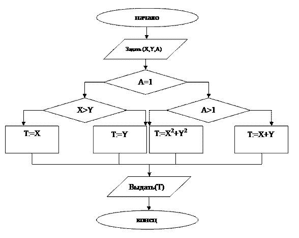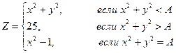 Dim X As Single, Y As Single Dim A As Single, T As Single X = Val(TextBox1) Y = Val(TextBox2) A = Val(TextBox3) If A = 1 Then If X > Y Then T = X Else T = Y End If Else If A > 1 Then T = X * X + Y * Y Else T = Abs(X + Y) End If End If TextBox4 = Str(T)