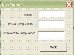 Private Sub CommandButton1_Click() Dim S As Integer, D As Integer, K As Integer Dim I As Integer, N As Integer, C As String*1 N = Len(TextBox1) S = 0: K = 0 For I = 1 To N C = Mid(TextBox1, I, 1) D = Val(C) S = S + D K = K +1 Next I TextBox2 = Str(S) TextBox3 = Str(K) End Sub
