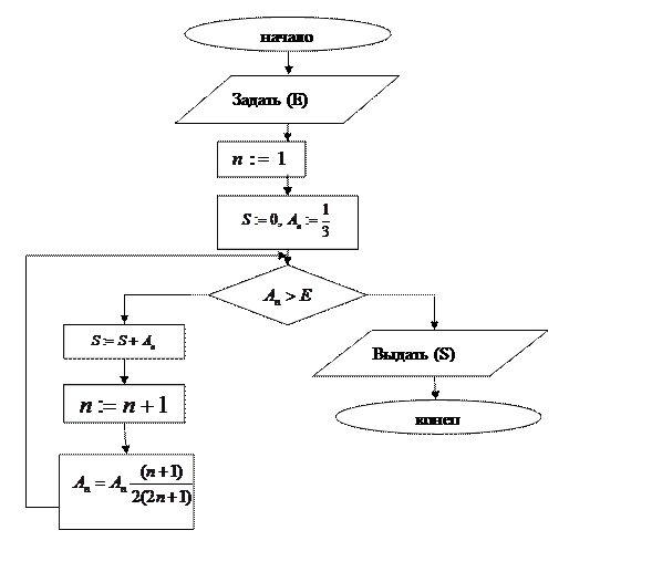 Код Private Sub CommandButton1_Click() Dim Е As Single, Dim An As Single E= Val(TextBox1) S=0 n=1 An=1/3 Do While An>E S=S+An n=n+1 An=An*(n+1)/2/(2*n+1) Loop TextBox2 = Str(S) End Sub