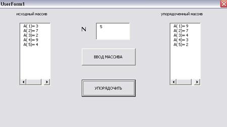 Private Sub CommandButton2_Click() For J% = 1 To N - 1 For I = J + 1 To N If A(I) > A(J) Then v! = A(I) A(I) = A(J) A(J) = v End If Next I Next J For I = 1 To N ListBox2.AddItem "A(" + Str(I) + ")=" + Str(A(I)) Next I End Sub