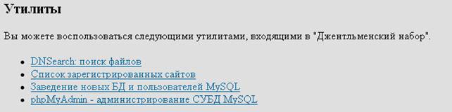 Ознакомление с инструментальной оболочкой конструирования баз и таблиц данных в среде MySQL. Любая СУБД реляционного (или другого) типа предоставляет набор утилит для доступа к хранимой информации. В MySQL в качестве инструментальной оболочки обычно используют систему phpMyAdmin или непосредственно используют командную строку OC. Панель управления базой данных MySQL – phpMyAdmin показана на рис. 1.38. В следующем разделе будут рассмотрены основные моменты работы с утилитой phpmyadmin, позволяющей упростить работу с CУБД MySQL. Прежде чем перейти к изучению утилиты phpmyadmin выполните следующее: Укажите в адресной строке браузера информацию http://localhost и Вы должны получить следующее окно (рис. 1.30).