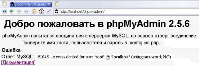 Рис. 1.31. Сообщение от phpMyAdmin. Сообщение: #1045 –Access denied for user ‘root’ @ ‘localhost’ (using password; NO) может вызвать массу рекомендаций по устранению ошибки установки, но практика показывает, что чаще всего на Вашей машине уже установлен MySQL и его запуск прописан в автозагрузке. Если Вы находитесь в Total Commander, то используя, например, клавиши Alt/F7 найдите на своей машине файл My.ini (рис. 1.32).