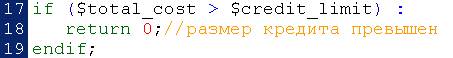 Существует и другой способ использования возвращаемых значений, при котором вызов функции включается прямо в условную/циклическую команду. В следующей программе (листинг 3.108) сумма счета пользователя сравнивается с предельным размером кредита. Алгоритм выглядит так: Объявить функцию check_limit(), которая при вызове получает два параметра. Первый параметр, $total_cost, определяет общую сумму счета, накопленную пользователем до настоящего момента. Второй параметр, $credit_limit, определяет максимальную сумму, которую может потратить пользователь. Объявление и состав функции на рис. 3.108 представлено строками 13-22. Если накопленная сумма счета превышает предельный размер кредита, функция возвращает ложное значение (0).