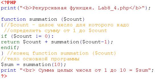 Рис. 3.111. Результат Lab8_3.php. Задание 6.Рекурсивные функции. Lab8_4.php Ситуация, при которой функция многократно вызывает сама себя, пока не будет выполнено некоторое условие, открывает замечательные возможности. При правильном использовании рекурсивные функции уменьшают объем программы и делают ее более выразительной. Рекурсивные функции особенно часто используются при выполнении повторяющихся действий -- например, при поиске в файлах/массивах и построении графических изображений (например, фракталов). Классическим примером рекурсивных функций, встречающимся во многих курсах программирования, является суммирование чисел от 1 до N. Программа, приведенная в листинге 3.112, суммирует все целые числа от 1 до 10.