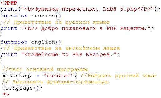 Следующая программа (листинг 3.114) демонстрирует эту непривычную, но полезную возможность. Допустим, программа выводит разную информацию в зависимости от языка, выбранного пользователем. В нашем примере для простоты используются приветственные сообщения для англо- и русскоязычных пользователей. Алгоритм: Создать сообщение для русского языка в функции с именем rushian. Создать сообщение для английского языка в функции с именем english. Передать информацию о выбранном языке в сценарий, присвоив значение переменной $language.
