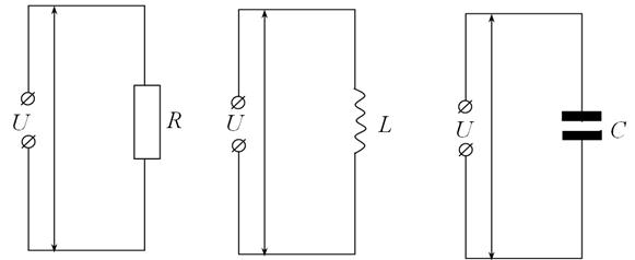 Рисунок 1. Рисунок 2. Рисунок 3. Подключение в цепь переменного тока сопротивления «R» (рис. 1), индуктивности «L» (рис.2) и конденсатора электроемкостью «С» (рис. 3)