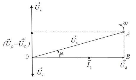 Для определения угла сдвига фаз Для построения векторной диаграммы отложим по горизонтальной оси вектор тока, равный по величине амплитудному значению I0 (рис. 5). Тогда мгновенное значение силы тока Так как на активном сопротивлении вектор тока совпадает с вектором напряжении по фазе, то Для нахождения результирующего вектора напряжения