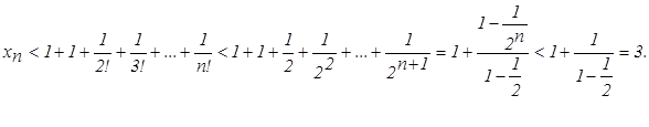 Кожен доданок у виразі xn+1 більший відповідного значення xn, і, крім того, в xn+1 додається ще один позитивний доданок. Таким чином, послідовність {xn} зростаюча. Доведемо тепер, що при будь-якому n її члени не перевершують трьох: xn < 3.
