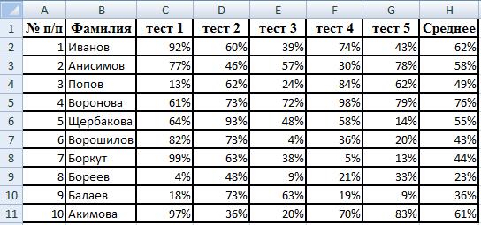 Рис. 1. Таблица «Результаты тестирования»