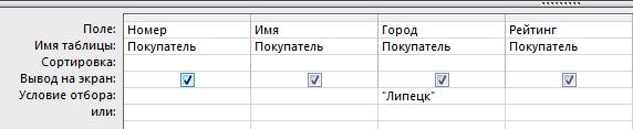 Если вы прямо сейчас откроете запрос (нажав кнопку Открыть в окне База данных), то увидите записи обо всех покупателях из таблицы Покупатели. Поскольку требуются сведения только о покупателях из Липецка и Саратова, необходимо поставить соответствующее условие отбора. Для установки условия отбора вам может понадобиться выражение, по которому MS Access будет выбирать записи. Нам нужно получить список покупателей из Липецка и Саратова, поэтому условие отбора должно быть задано для столбца Город. Для задания этого условия выполните следующие действия: