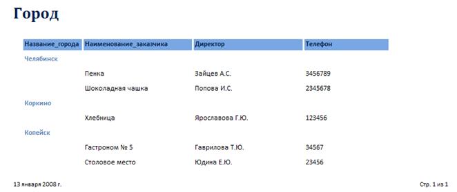 Отчеты Запросы Пользовательский интерфейс Для организации пользовательского интерфейса должны быть созданы четыре формы: 1. Главная кнопочная форма. На главной кнопочной форме находятся кнопки, которые запускают формы и отчеты, а также кнопка закрытия приложения (для этого форму необходимо делать в режиме конструктора). 2. Форма «Продукция» создана для удобного заполнения таблицы «Продукция. 3. Форма «Отгрузка» создана по двум связанным таблицам «Отгрузка» и «Продукция». На форме организовано вычисляемое поле «Стоимость», которое перемножает поле «Количество» из таблицы «Отгрузка» и поле «Цена» из таблицы «Продукция». 4. Форма «Склады» с подчиненной формой «Продукция» позволяет просматривать, какие виды продукции хранятся на том или ином складе. 1. Запрос на выборку «Отгрузка» выводит на экран все отгрузки, совершенные первого января, а также рассчитывает стоимость отгрузки. 2. Запрос с параметром «Заказчики» предлагает пользователю ввести город и выводит всех заказчиков, фирма которых находится в этом городе. Дополнительно: 3. Перекрестный запрос «Отгрузка» в компактном виде представляет информацию о суммах поставок закупщикам в определенные дни. 4. Запрос на обновление «Рост цен на 20%» увеличивает стоимость всех товаров на 20%. 5. Итоговый запрос создан по таблице «Отгрузка» и считает сумму по полю «Количество» (количество отгруженной продукции по дням). 1. Отчет «Заказчики по городам» содержит группировку по городам.