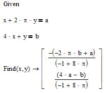 Решение: 1. Начните блок решения уравнений с ключевого слова Given 2. Введите два уравнения, используя [ Ctrl ]+ = для печати символа = 3. Вызовите функцию find с аргументами x и y для получения символьного решения системы уравнений. Вместо равенства вставьте знак символьной оценки ([ Ctrl ]+.)(рис. 5).
