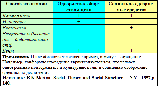 Типологизация девиантного поведения связана с трудностями, поскольку любые его проявления - осуществление аборта, пристрастие к спиртным напиткам, употребление в пищу свинины и т.д. - можно считать как девиантными, так и недевиантными; все определяется нормативными требованиями, на основе которых они оцениваются. Поэтому, наверное, нет смысла пытаться составить точную классификацию типов абсолютно девиантного поведения, хотя некоторые из них, например изнасилование и кровосмешение, большинство людей {но не все) считают девиантными. Каким же образом типологизировать девиантное поведение? По-видимому, классификация девиантных поступков, предложенная Мертоном, наиболее удачна из всех разработанных до сих пор. Мы уже знакомы с его концепцией - девиация возникает в результате аномии, разрыва между культурными целями и социально одобряемыми средствами их достижения. Исходя из этого Мертон строит типологию девиантных поступков. Она представлена в табл. 7-3. В системе Мертона, тотальный конформизм предполагает согласие с целями общества и законными средствами их достижения. Молодой человек или девушка, которые получают хорошее образование, находят престижную работу и успешно продвигаются вверх по служебной лестнице, - олицетворение конформизма; они ставят перед собой цель (скажем, финансовый успех), и достигают ее законными средствами. Следует учитывать, что конформизм представляет собой единственный тип недевиантного поведения. Вторая возможная реакция называется инновацией; она предполагает согласие с одобряемыми данной культурой целями, но отрицает социально одобряемые способы их достижения. "Инноватор" будет использовать новые, но незаконные средства достижения богатства - он занимается рэкетом, шантажом или совершает так называемые "преступления белых воротничков" (вроде растраты чужих денег). Третья реакция, названная ритуализмом, предполагает отрицание целей данной культуры, но согласие (порой доведенное до абсурда) использовать социально одобряемые средства. Бюрократ, фанатически преданный своему делу, настаивает, чтобы каждый бланк был тщательно заполнен, дважды проверен и подшит в четырех экземплярах. В конце концов он становится жертвой жестокой бюрократической системы и спивается от отчаяния. Происходит это именно потому, что обнаруживается забвение цели деятельности - для чего все это делается. Четвертая реакция, названная бегством от действительности (ретреатизм), наблюдается в случае, когда человек одновременно отвергает и цели, и социально одобряемые средства их достижения. Наиболее ярким проявлением ретреатизма становятся маргиналы: бродяги, пропойцы, душевнобольные, наркоманы и т.п. Наконец, бунт, подобно бегству от действительности, тоже одновременно отрицает и культурные цели, и социально одобряемые средства их достижения. Но он приводит к замене старых целей и средств на новые: развивается новая идеология, (она может быть революционной). К примеру, систему социалистической собственности, вытесняющую частную собственность, революционер считает более законной, чем существующую. Концепция Мертона важна, прежде всего, потому, что она рассматривает конформизм и девиацию как две чаши одних весов, а не как отдельные категории. В ней также сделан упор на то, что девиация не является продуктом абс