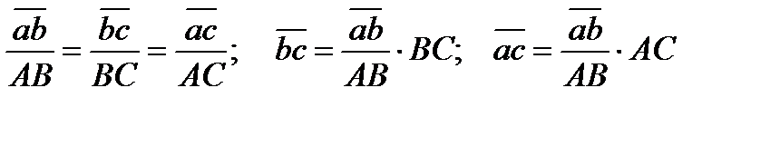 Швидкості полюсів В і А визначено раніше. Відносні швидкості VCА і VCB як швидкості в обертальному русі відповідно перпендикулярні до СА і СВ. Проведемо через точку А на плані швидкостей лінію, перпендикулярну до АС, а через точку В - лінію, перпендикулярну до ВС. На їх перетині дістанемо точку С. Трикутник аbс на плані швидкостей подібний до трикутника АВС на плані механізму. (Відповідно до побудови плану швидкостей аb ┴ АВ, ас ┴ АС, bc ┴ ВС, отже, кути їх при відповідних вершинах рівні між собою, а аbс~ АВС). Звідси: