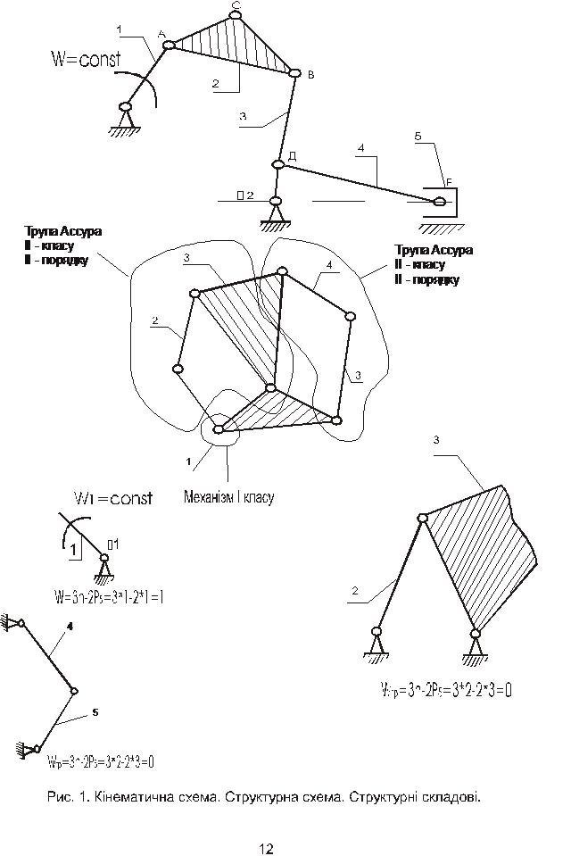 Задача 1. Метою структурного аналізу є вивчення теорії створення механізмів. Структурний аналіз виконується в розрахунково-пояснювальній записці до контрольної роботи в такій послідовності: зображають кінематичну схему механізму в довільному масштабі; підраховують кількість ланок, у тому числі кількість рухомих ланок; рахують число кінематичних пар у механізмі; встановлюють (за Артоболевським) клас кінематичних пар; знаючи правила зображення ланок (простих і складних), складають структурну схему. При цьому слід пам'ятати про те, що треба вилучити пасивні умови зв'язку; вилучити зайві ступені рухомості; замінити вищі кінематичні пари Р4 (IV класу) двома нижчими кінематичними парами Р5 (V класу) і ланками; поступальні пари замінити парами обертальними. Визначають ступінь рухомості важільного механізму. Після виконання цього пункту ступінь рухомості механізму повинна дорівнювати числу ведучих ланок. Зі складеної структурної схеми, починаючи з найвіддаленішого від ведучої ланки, треба виділити ланцюг з парним числом ланок. Оскільки в практиці найбільше груп Ассура ІІ класу, то спочатку виділяють найпростішу двоповідкову групу. Ступінь рухомості її має дорівнювати нулю. Далі перевіряють ступінь рухомості механізму, що залишився. Він не повинен змінитися. Визначають клас і порядок виділеної групи Ассура. Виділяють наступний кінематичний ланцюг, перевіряють ступінь рухомості механізму, що залишився. Установлюють клас і порядок виділеної групи Ассура. Так діють доти, доки не дійдуть до ведучої ланки. За класом старшої групи Ассура визначають клас і порядок механізму в цілому, вказавши, при якій ведучій ланці виконано структурний аналіз. Записують структурну формулу механізму, наприклад: I 0.1 → II 2.3 → II 4.5 Це означає, що до ведучої ланки і стояка (механізму I класу) приєднано групу Ассура II класу II порядку, до неї - групу Ассура II класу II порядку і, нарешті, групу Ассура II класу II порядку.