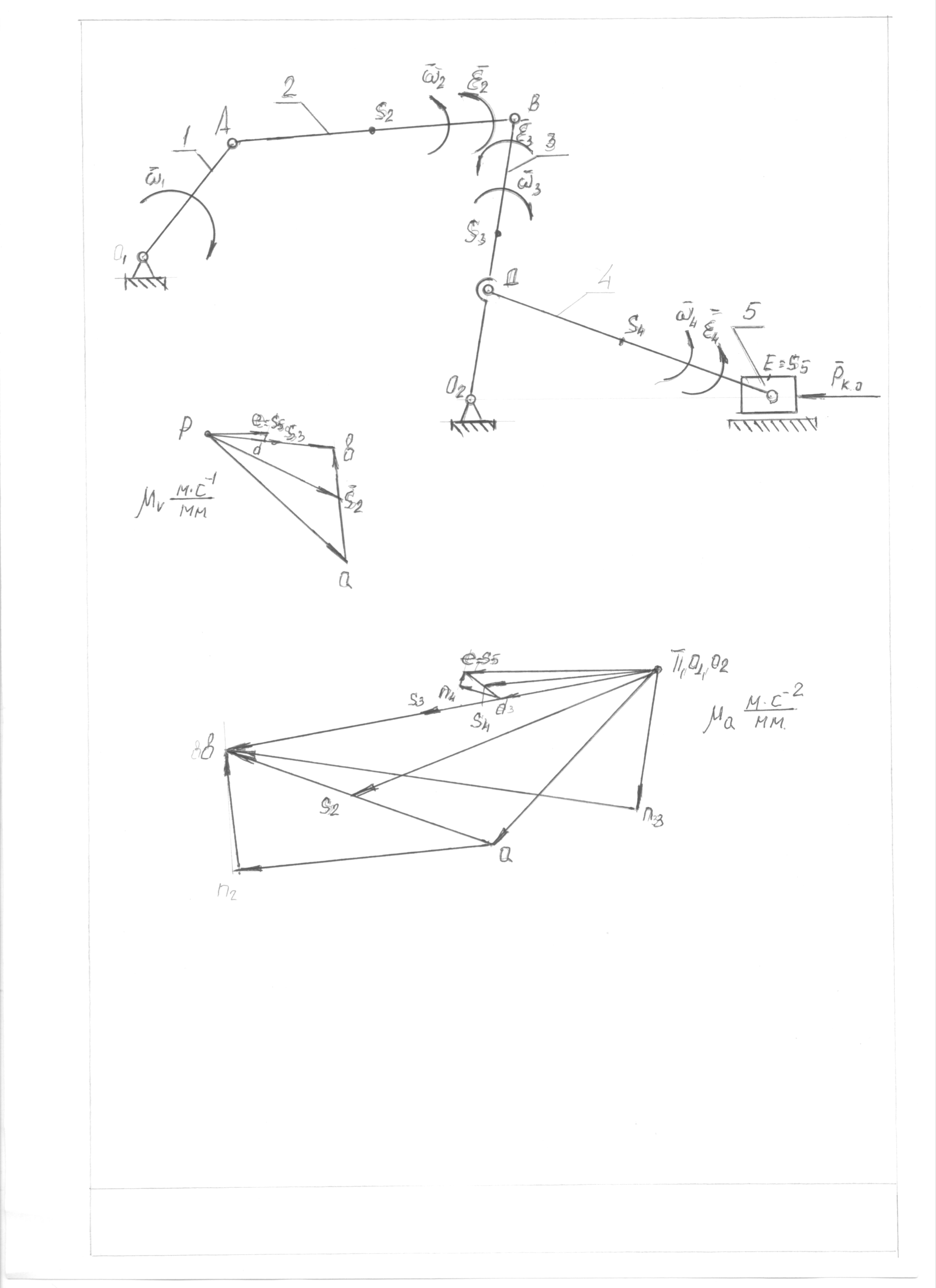 міліметрах на плані прискорень і плані механізму, методом засічок з точок а і b радіусами са і сb, знайти точку C на плані прискорень. При цьому треба користуватися правилом обходу, щоб не зробити засічку так, що на плані механізму обхід контуру АВС здійснювався б за годинниковою стрілкою, а на плані прискорень обхід фігури аbс був би проти годинникової стрілки. Користуючись подібністю, визначимо прискорення центрів ваги S2,, S3,, S4 ланок. Кутові прискорення ланок знаходимо за формулами: