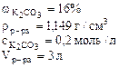 Рассчитываем массу 16%-ного раствора К2СО3, который содержит 82,8 г К2СО3. Составляем пропорцию: 100 г р-ра - 16 г К2СО3 mр-ра(16%) - 82,8 г К2СО3. mр-ра(16%) = Определим объём 16% - ного раствора:
