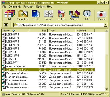 Существует несколько версий RAR, ARJ, ZIP для различных операционных систем, в частности, для DOS, OS/2, Windows, UNIX. Рассмотрим RAR в Windows.